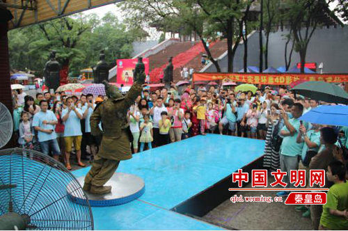 2016年7月7日,記者來(lái)到秦皇求仙入海處。在求仙殿廣場(chǎng)的東南方舞臺(tái),伴著富有節(jié)奏感的音樂響起,“泡泡大叔”的街舞表演準(zhǔn)時(shí)開始。他穿著皮質(zhì)的兵馬俑服裝,蹬著黑色軍靴,臉上涂滿灰色油彩。只見他雙腳不動(dòng),雙手舞動(dòng)前伸,身體前傾與地面成45度。固定幾十秒后,身體慢慢復(fù)位站直,又隨著音樂跳起了街舞。大約半個(gè)小時(shí)后,汗如雨下的“泡泡大叔”沖到電扇前吹風(fēng),一口氣喝下2瓶藿香正氣水,又跑回舞臺(tái)繼續(xù)表演。